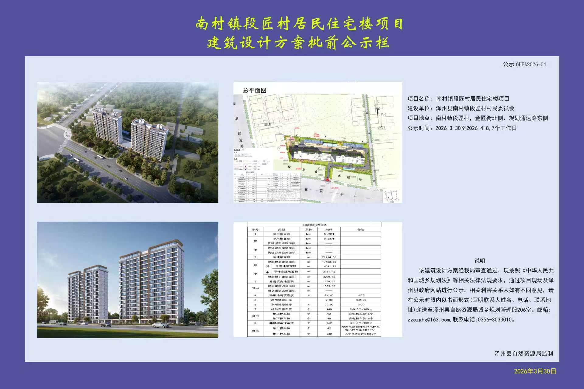 南村镇段匠村居民住宅楼项目建筑设计方案批前公示栏
