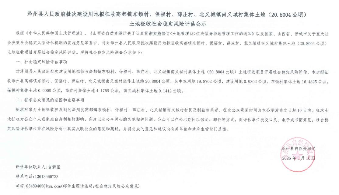 泽州县人民政府批次建设用地拟征收高都镇东顿村、保福村、薛庄村、北义城镇南义城村集体土地(20.8004公顷) 土地征收社会稳定风险评估公示