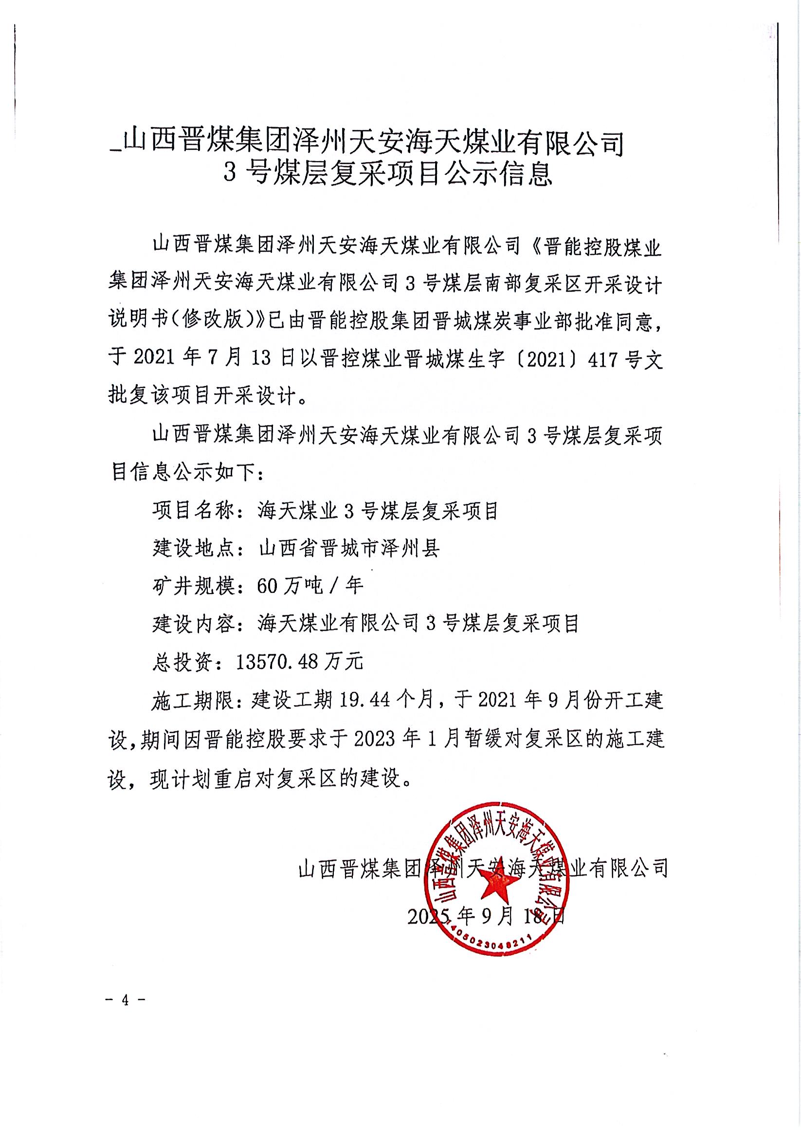 山西晋煤集团泽州天安海天煤业有限公司3号煤层复采项目公示信息