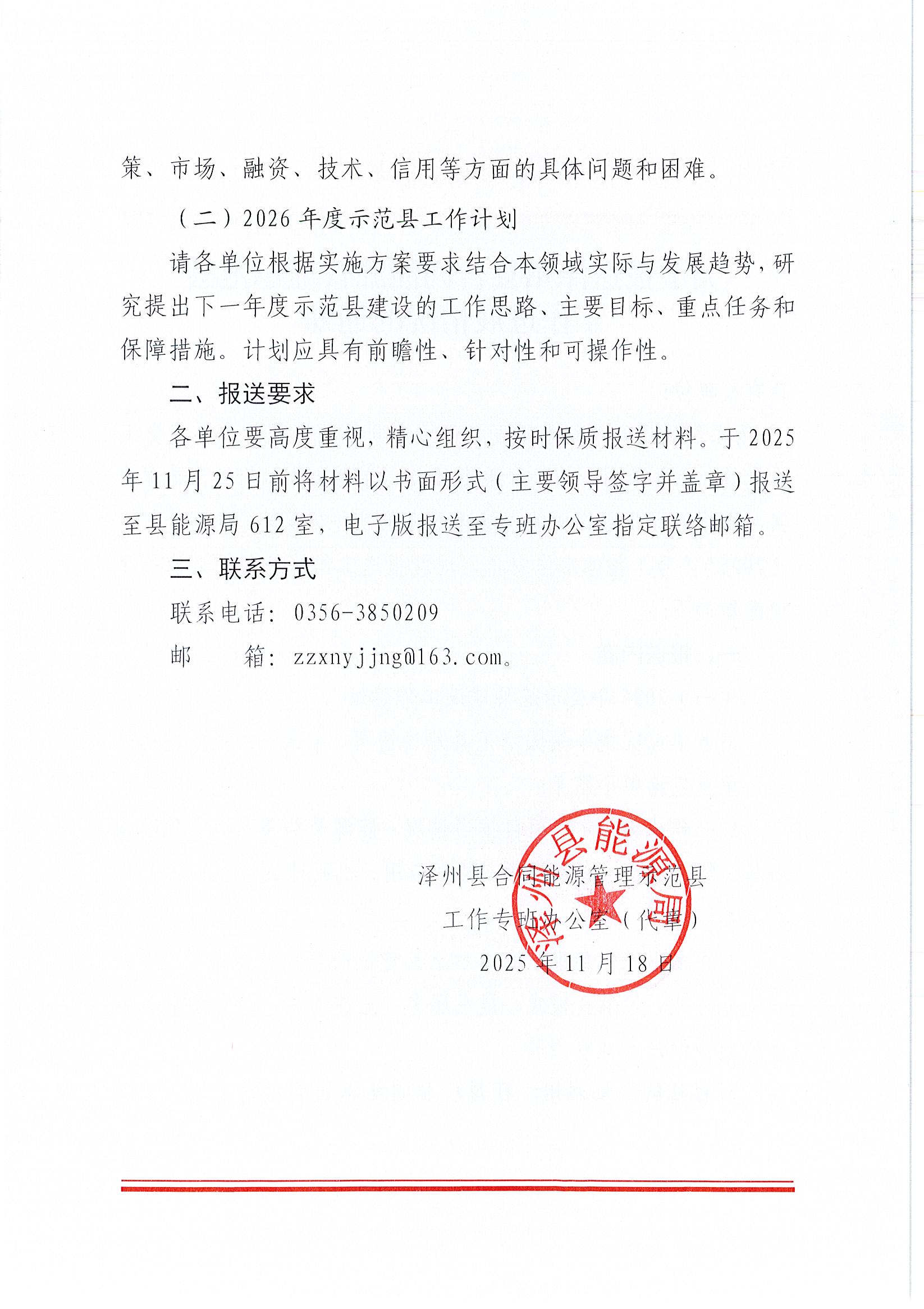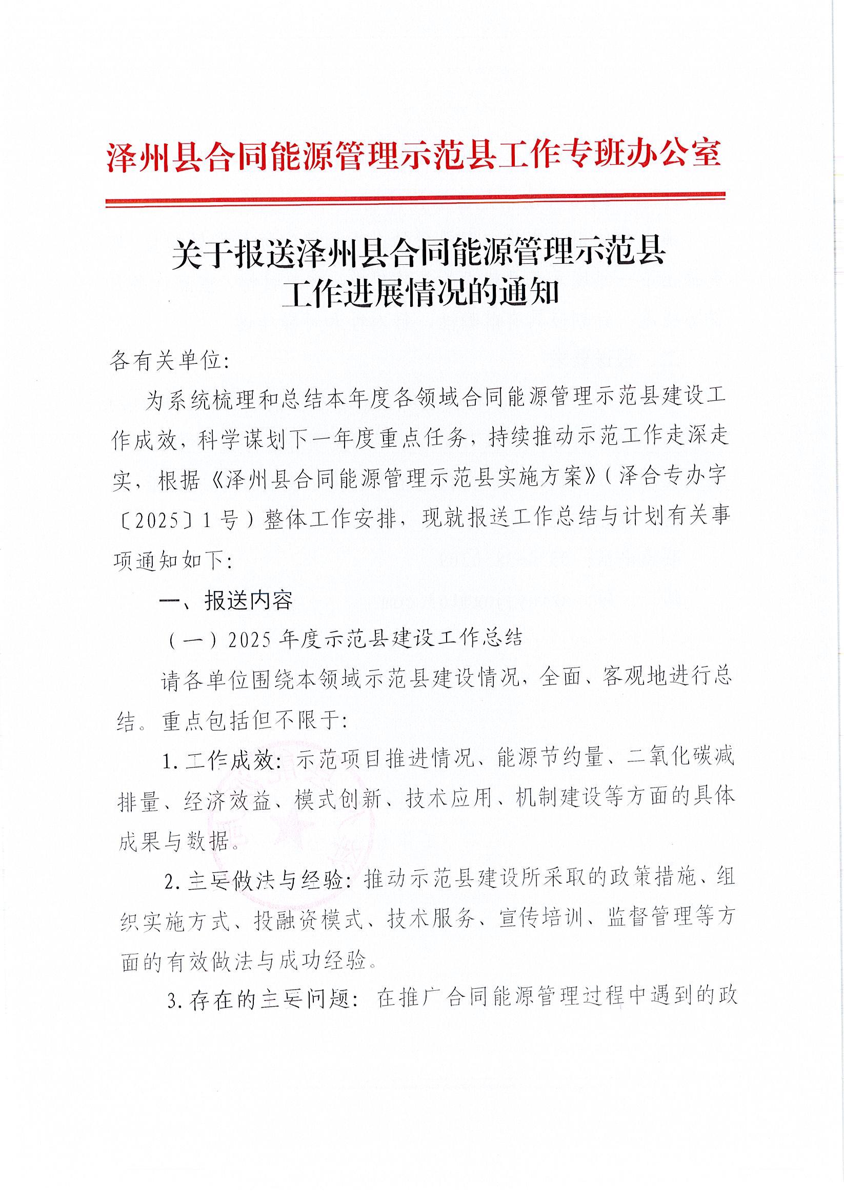 泽州县合同能源管理示范县工作专班办公室关于报送泽州县合同能源管理示范县工作进展情况的通知