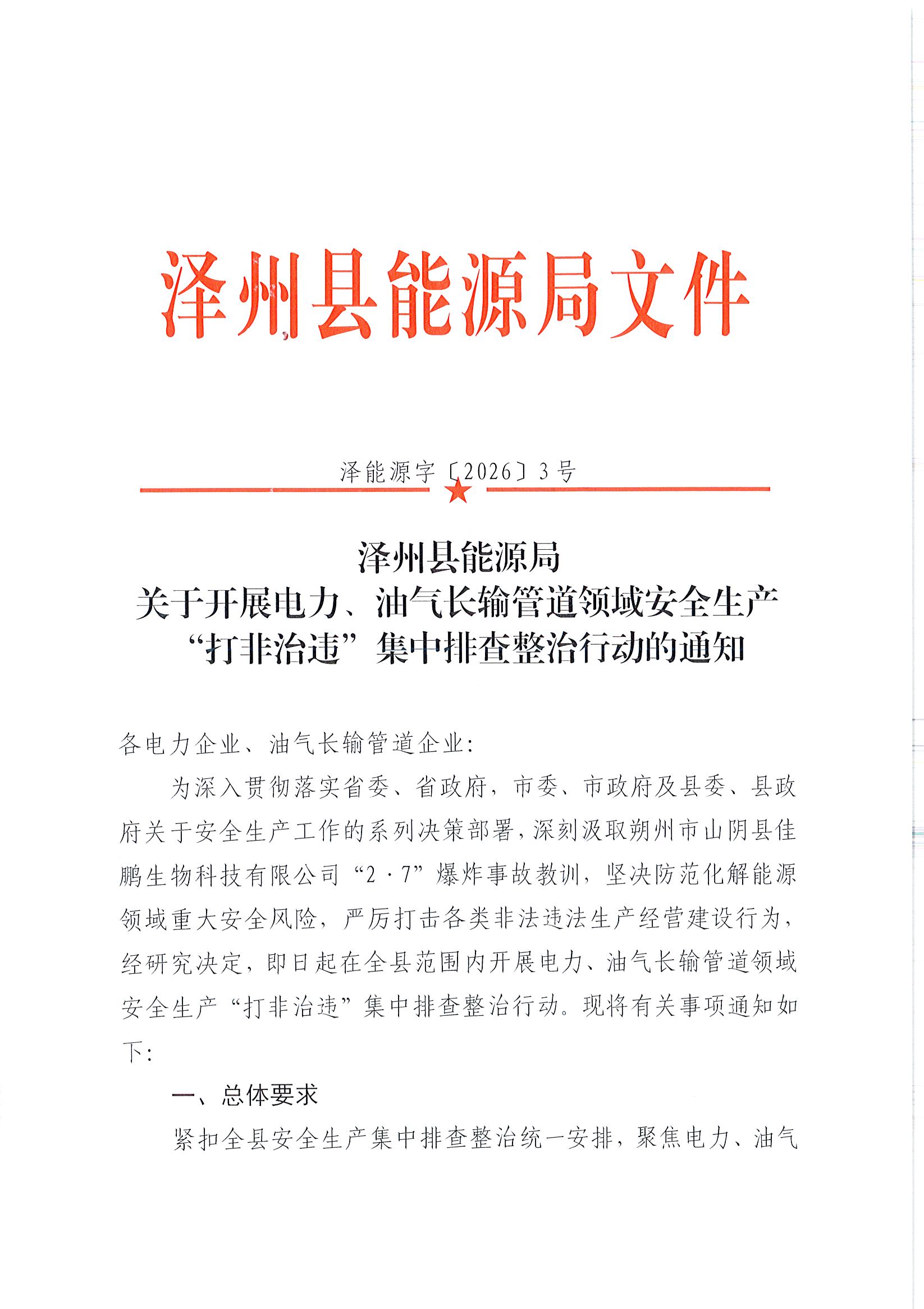 泽州县能源局关于开展电力、油气长输管道领域安全生产 “打非治违”集中排查整治行动的通知