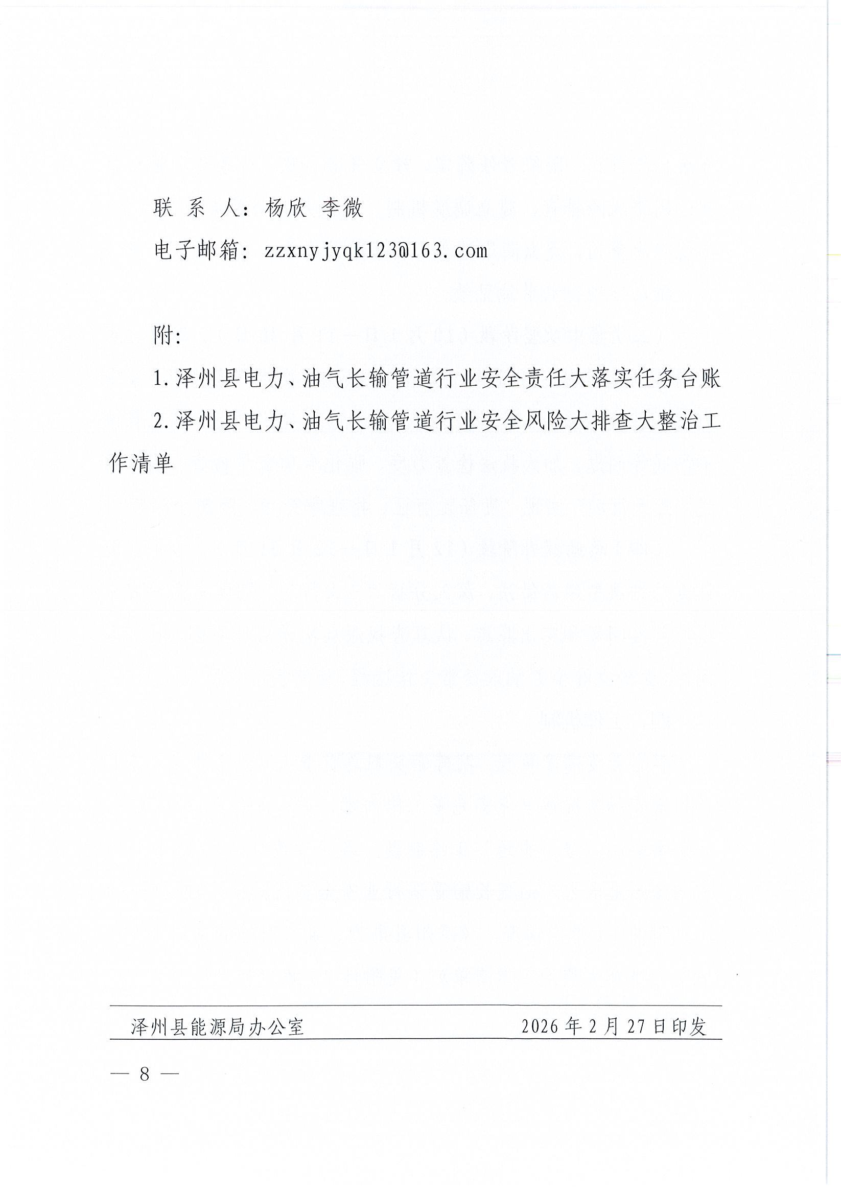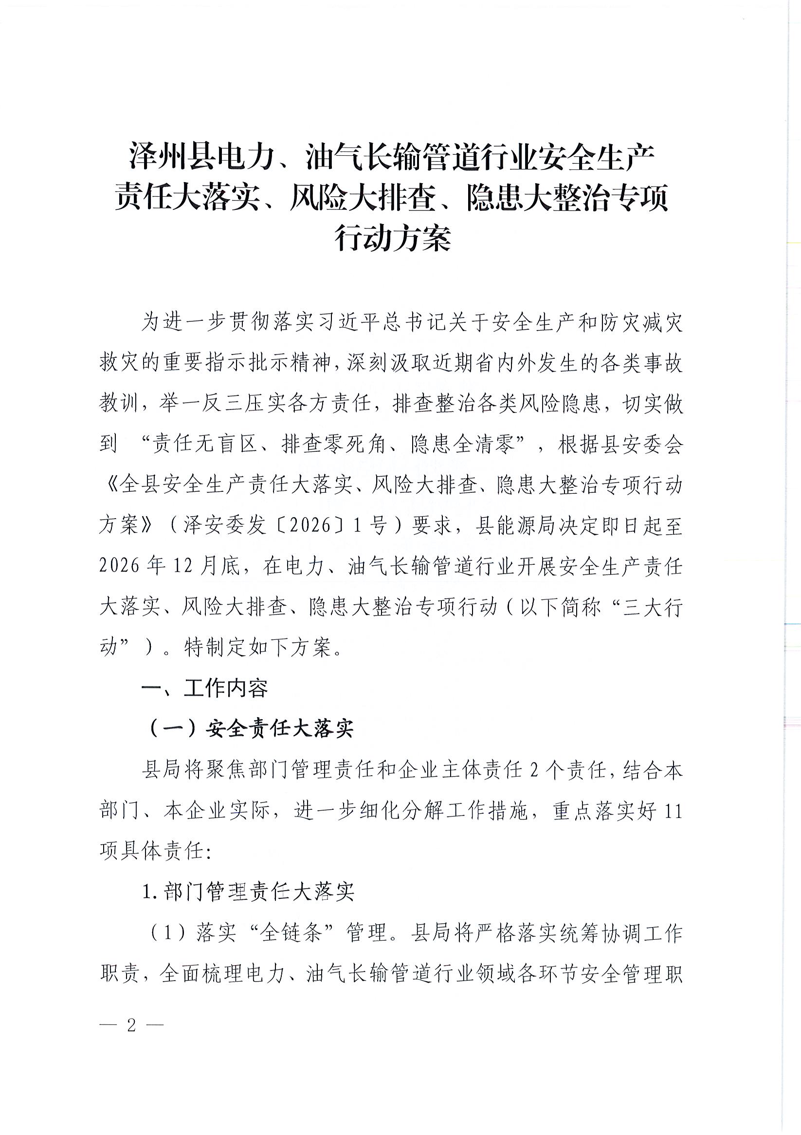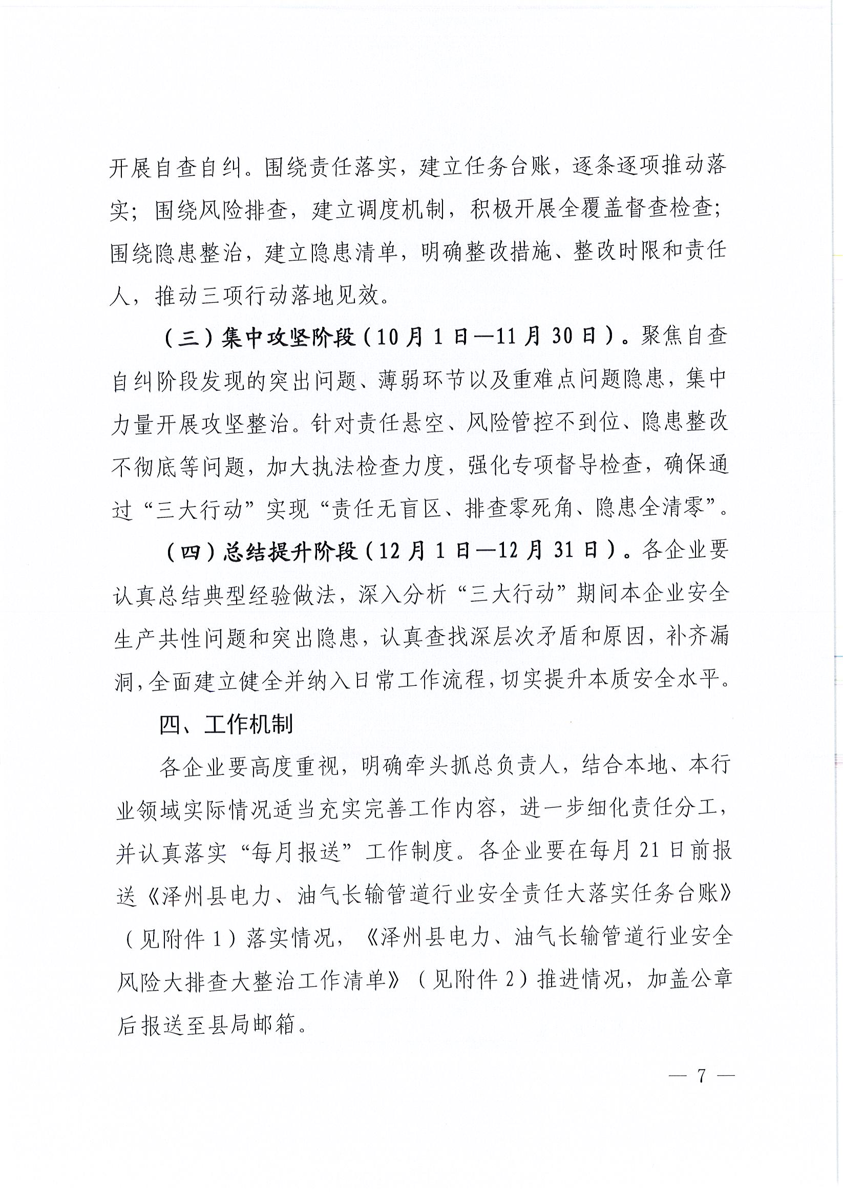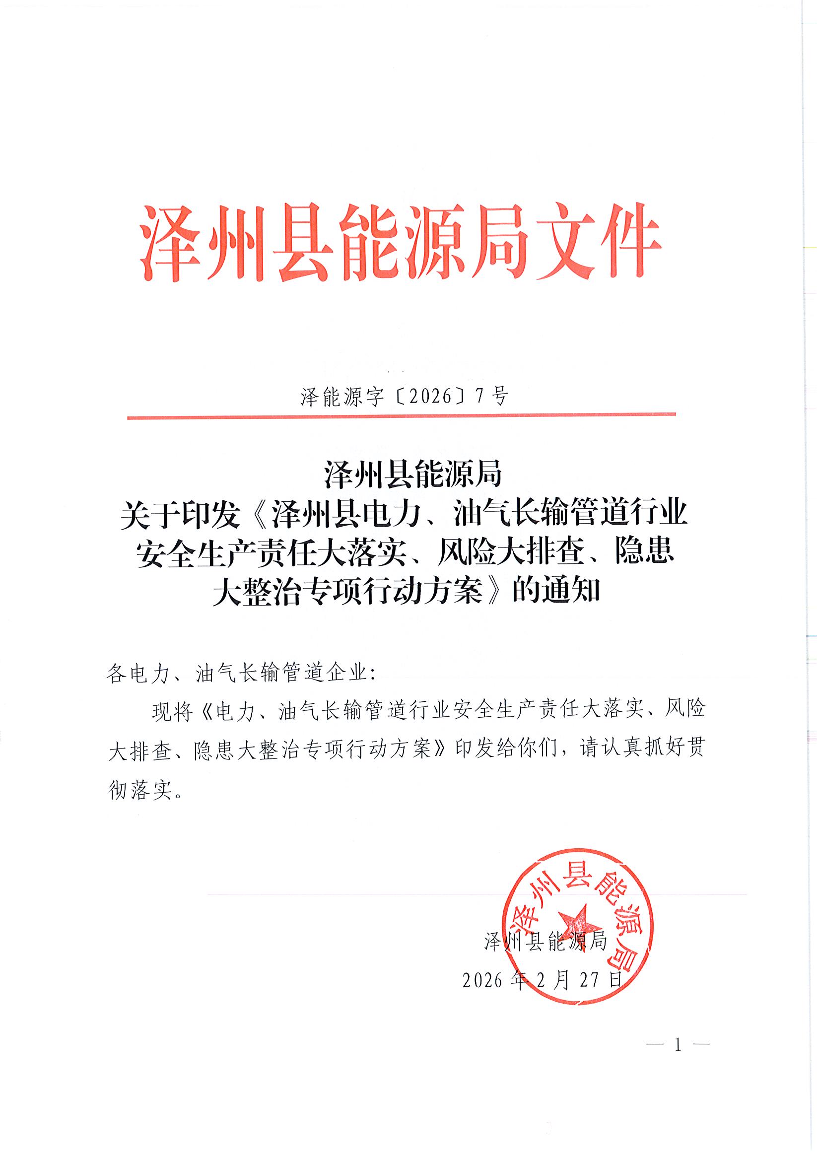 泽州县能源局关于印发《泽州县电力、油气长输管道行业安全生产责任大落实、风险大排查、隐患大整治专项行动方案》的通知